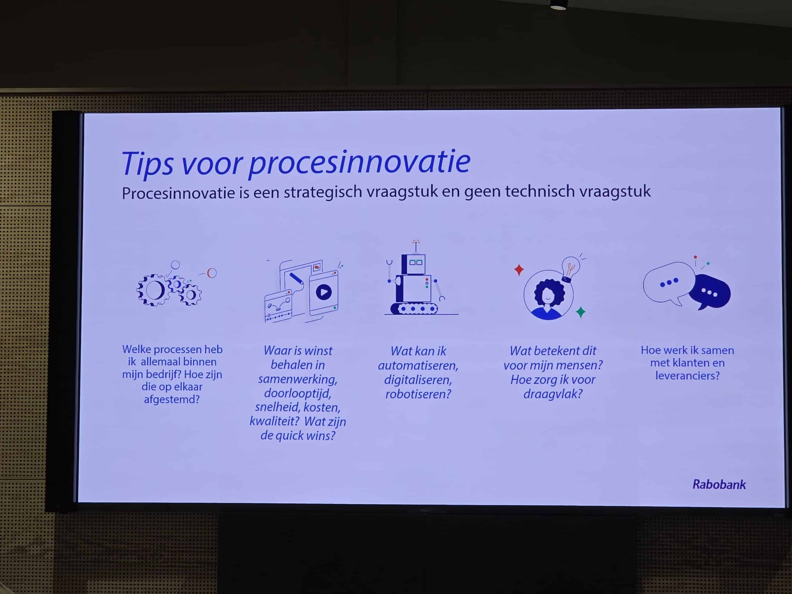Samen met Rabobank gingen ondernemers, onderwijs en experts in gesprek over hoe robotica kan bijdragen aan slimmere, snellere en efficiëntere processen binnen bedrijven. Het toverwoord is procesinnovatie! Bedrijven die robotisering omarmen, maken hun organisatie toekomstbestendig. Ontdek de mogelijkheden binnen jouw organisatie, doe kennis op bij fieldlabs of bedrijven die al een stap verder zijn en analyseer je processen zorgvuldig.